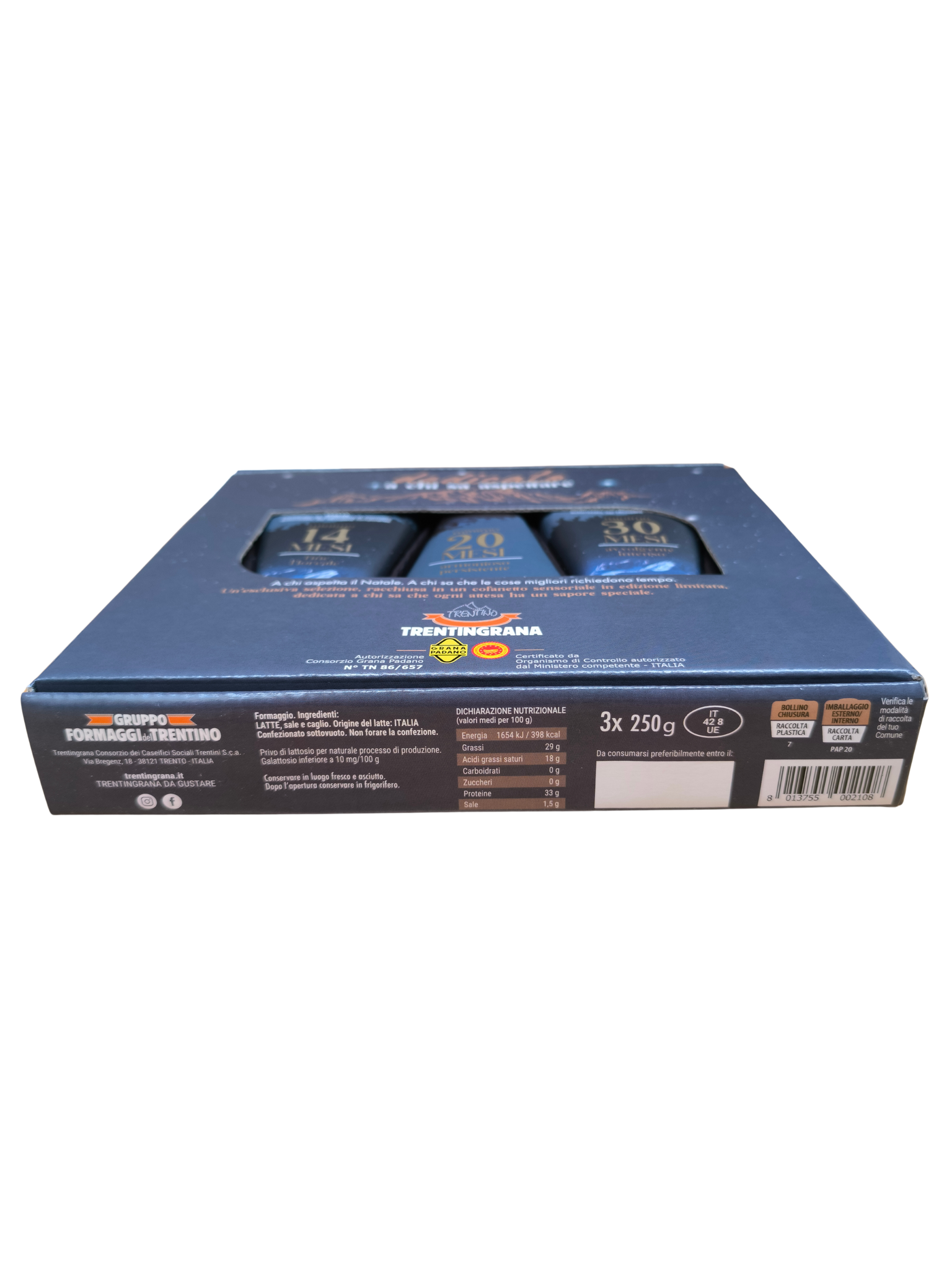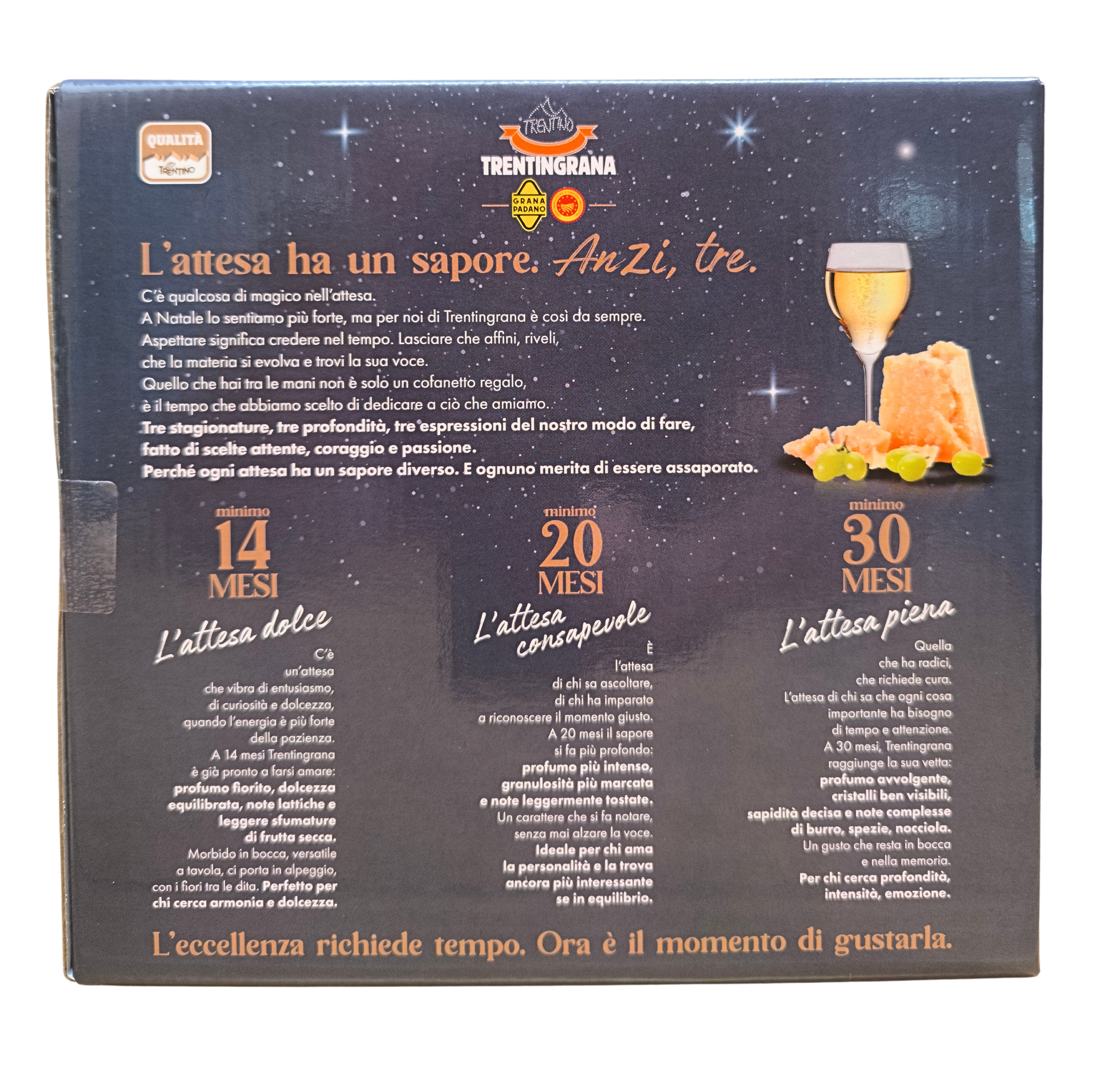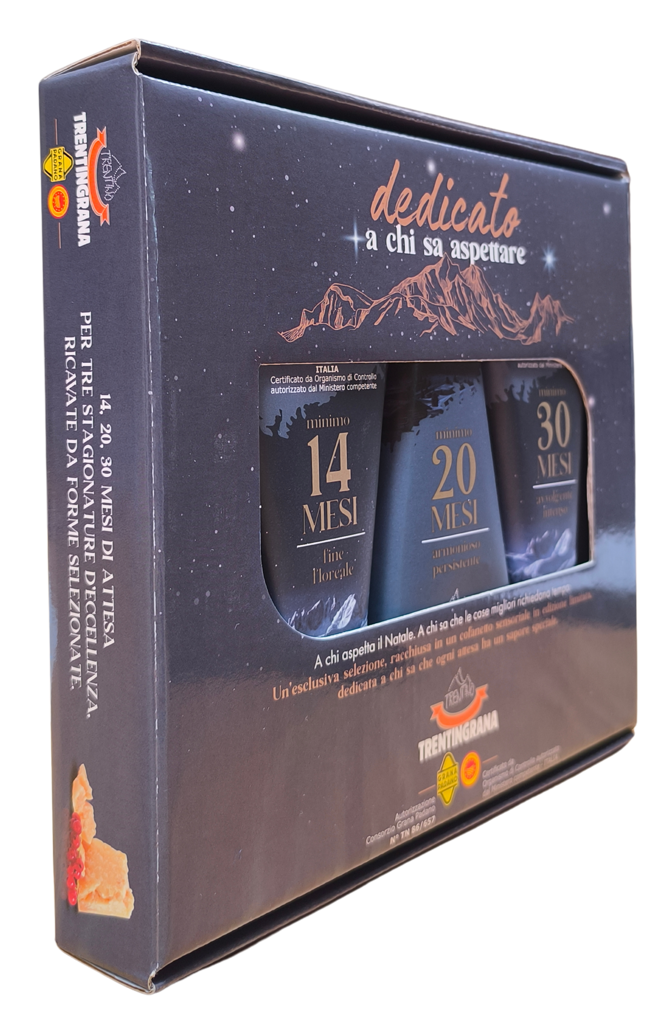 Un’elegante scatola di Natale racchiude un tris di spicchi da 250 g di Trentingrana nelle stagionature 14, 20 e 30 mesi: un viaggio nel gusto che parte dalle note fresche e lattiche dei 14 mesi, attraversa la dolcezza equilibrata dei 20 mesi e arriva all’intensità profumata dei 30 mesi, celebrando il tempo, la cura e il lavoro dei caseifici trentini, e regalando emozioni autentiche come quelle del Natale.