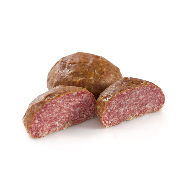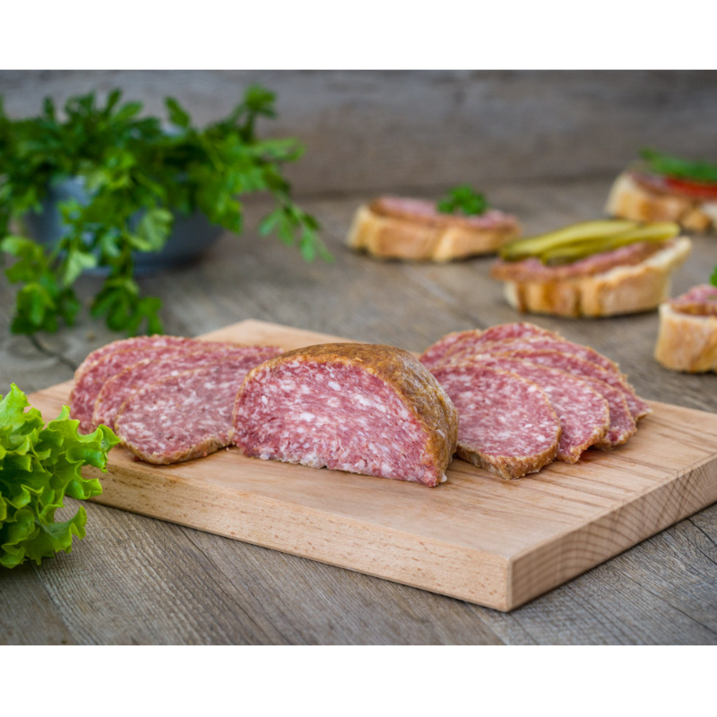 Gusto e tradizione. La mortandela è il salume simbolo della Val di Non, prodotto dalla carne di suini e bovini che crescono nelle valli del Trentino grazie alla cura e alla dedizione degli allevatori. La carne macinata viene lavorata dagli esperti norcini fino all'aggiunta di pepe nero, aglio ed altre spezie: dall'impasto vengono realizzate grandi polpette schiacciate, disposte in retini. Il prodotto subisce dunque un delicato processo di affumicatura, al quale segue la stagionatura di almeno 3 settimane.