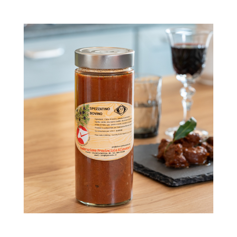 Gusto intenso e consistenza morbida da sciogliersi in bocca. Ecco lo spezzatino di manzo cucinato solo con ingredienti genuini: carne a pezzettoni, passata di pomodoro, verdure e vino bianco.