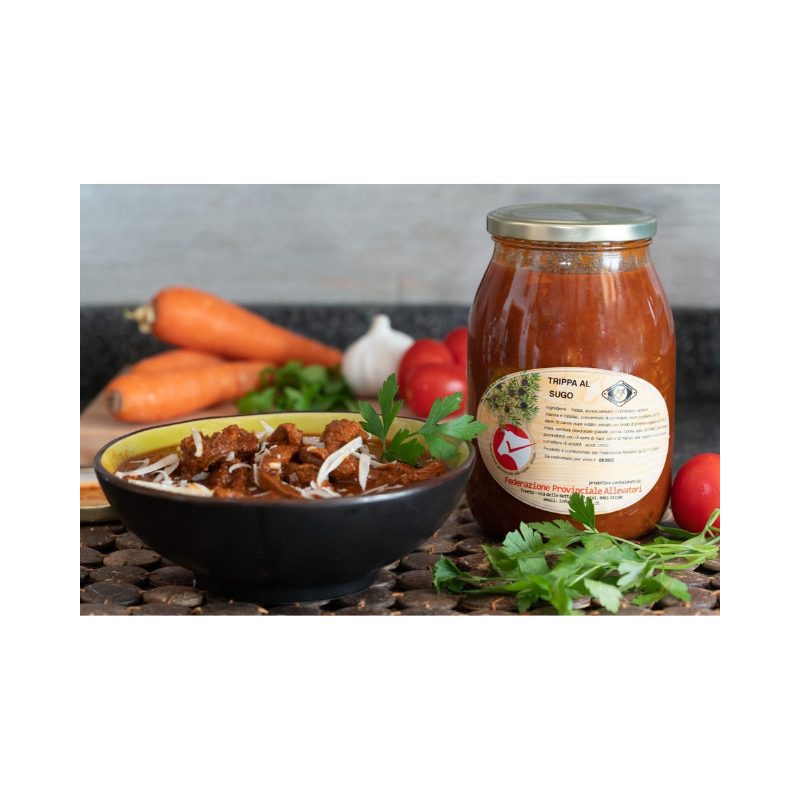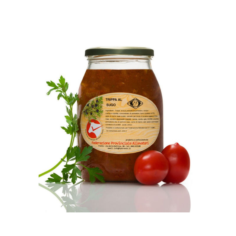 La trippa proviene dai migliori bovini allevati sui pascoli e nelle stalle delle valli trentine. Gli animali sono alimentati solo con prodotti genuini, privi di organismi geneticamente modificati. Dopo essere stata sbollentata nel brodo di carne, la trippa viene tagliata a strisce e cucinata a lungo in padella con verdure che crescono negli orti delle nostre valli: carota, cipolla e pomodoro.